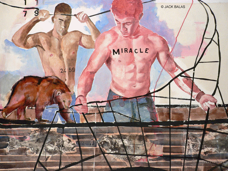 Jack Balas, 2023; MIRACLE (#2459.1179) Oil, ink & acrylic on canvas and collaged papers, 56" x 48"