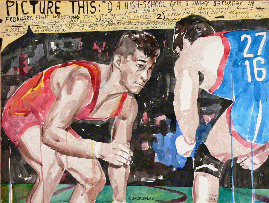 1) A high school gym, a snowy Saturday in February, eight wrestling