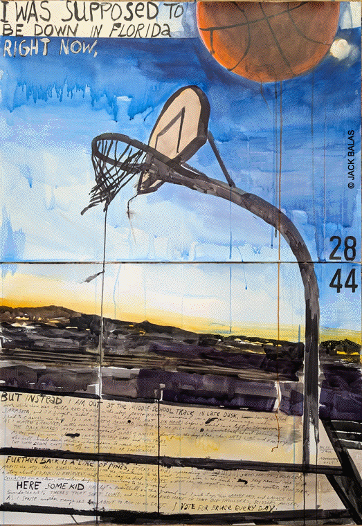 sitting on the bleachers, a basketball court behind me as I watch