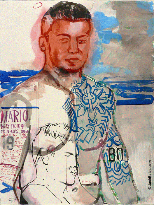 Mario was doing chin-ups on a bar at the beach. The tatt on his chest of his brother really had a lot to say. Not that he much looks like this, but I'm goin' with it. |