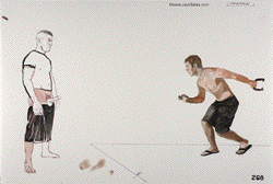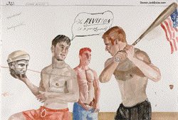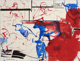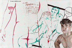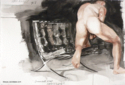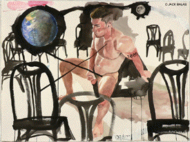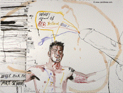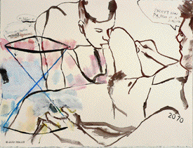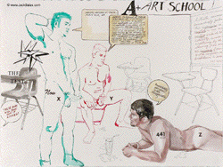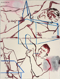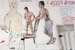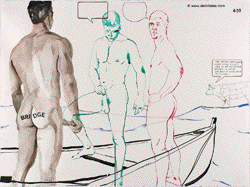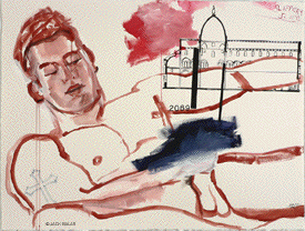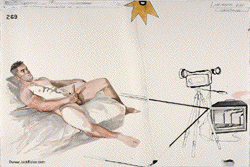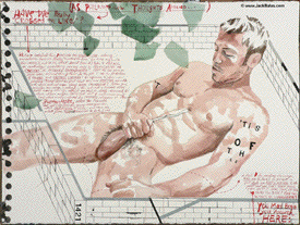 The paintings below have been gathered onto this page due to their sexual imagery. Having said that, they really have less to do with sex than with politics, ageing and sexuality in general -- of anyone, wthin a long history of artists using explicit imagery to delve into sexual politics, (for example Manet, Picasso, Egon Schiele, David Wojnarowicz, and Lynda Benglis), not to mention the many contemporary artists borrowing on pornography or simple erotica (eg. Tom Wesselman, Jeff Koons, John Currin). The works recontextualize youthful and idealized bodies into situations all of us share to varying degrees in our daily lives -- having to do with thoughts not only about sexual gratification, but how we feel about ourselves, and how sexuality of any kind figures into a Puritan society where religious taboos continually try to douse the subject with cold water (if not outlaw it completely). Amid the explosion of online pornography these days, I'm interested in asking if or how you can de-porn pornography? The texts on some of these drawings come from pompous-sounding reviews and articles in current art magazines, raising issues (in my mind) about what "art" in its many guises, is trying to accomplish today. Does some of what we see in museums and galleries amount to little more than a type of sexual gratification for the artists (and the viewers)? More pointedly, does art that claims efficacy towards political and social goals or awareness amount to anything more than pornography? Hard to figure indeed. Any depiction of sexual activity here has been based on online imagery and does not necessarily reflect a person's sexual identity. The models here whom I've hired to pose are, to my knowledge, heterosexual and happily so. But they live in and reflect changing times, and seem quite accepting about sexual identity either way, complicit not only in its depiction but also in our gaze. |