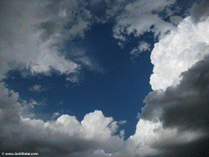 Two hawks are circling up in a blue hole, the rest of the sky