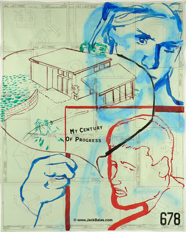 Jack Balas, 2011; MY CENTURY OF PROGRESS (#678); ink and acrylic on collage of highschool mechanical drawing plates, 38" x 30.5"