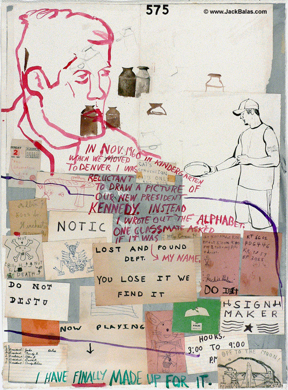 Jack Balas, 2011; OUR NEW PRESIDENT KENNEDY (#575); ink on paper with collage of various drawings & notes c. 1960's; 30" x 22"