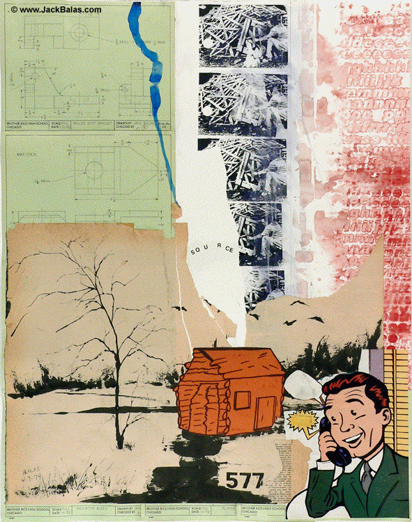 Jack Balas, 2011; SOURCE (#577); acrylic silkscreen and ink on paper with collage of drafting plates and other drawings; 33" x 26"