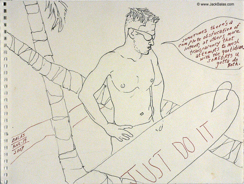 Jack Balas, 2009; Honolulu Drawing #19, OBSFUCATION (JUST DO IT); ink on paper, 9" x 12"