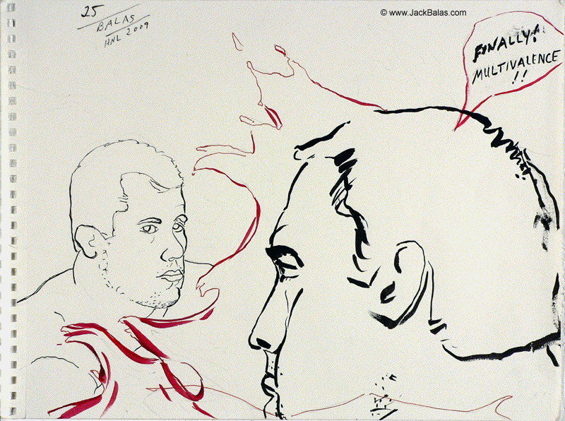 Jack Balas, 2009; Honolulu Drawing #25: FINALLY! MULTIVALENCE!; ink on paper, 9" x 12"