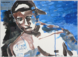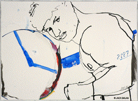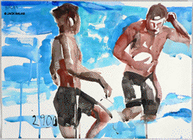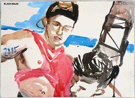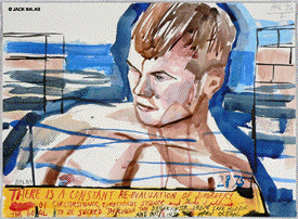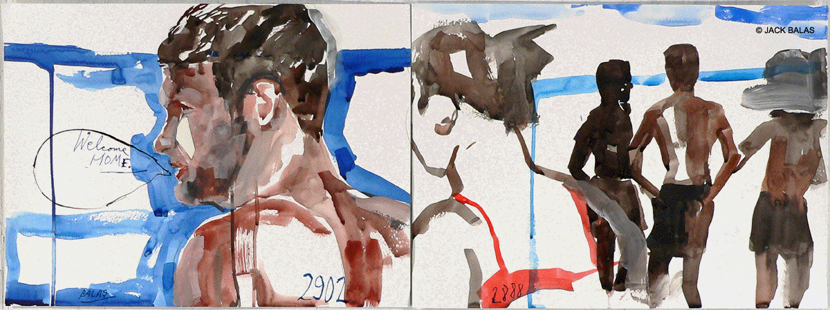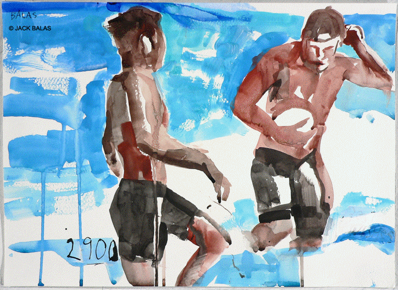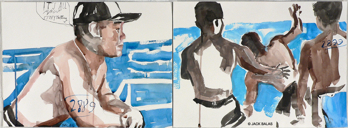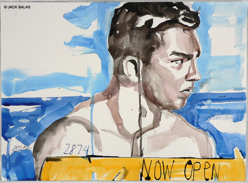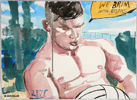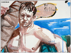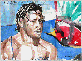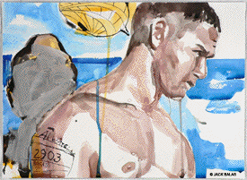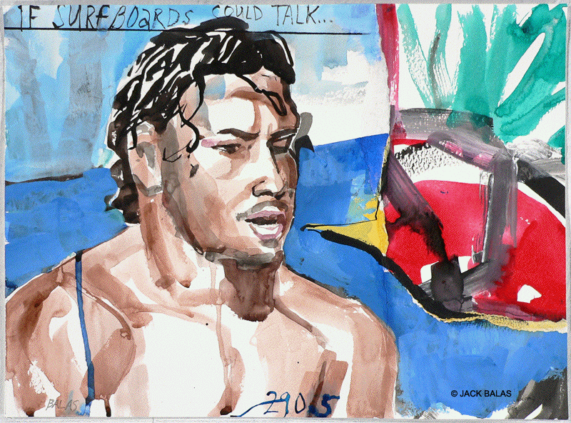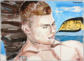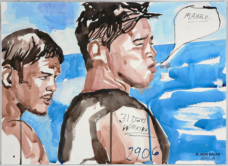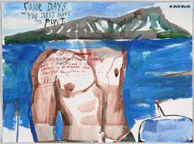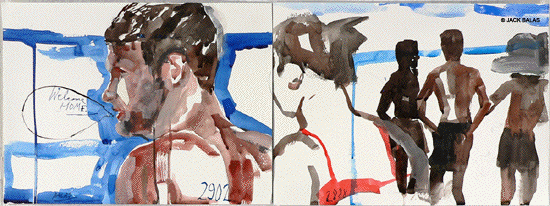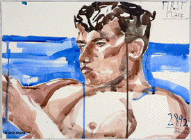 TATTOO DETOUR HONOLULU DRAWINGS 2026 Normally when traveling I've been content to walk around, explore and take photos while visiting art museums and galleries -- a method that works fine in New York or Paris when you're there for a week or so. But finding myself in Honolulu for an extended stay in 2007, I realized that Waikiki is a different animal altogether, relentless as it is with the shirtless men who are my muse, not only on the beach but in the restaurants, grocery stores, hotel lobbies, even on the bus. So I was tempted to go further than my normal mode and try to have a studio at the same time, namely a sketchpad and a handful of pens I was carrying around, creating a body of work out of a suitcase while living in a hotel room. Drawing on the aforementioned beaches, and in the same restaurants and hotel lobbies, I was able to enjoy a completely different rythmn of work than I've ever known at home, at the same time surrounded by people who occasionally wandered over to look at what I was up to so long at my favorite Starbuck's table or on some bench in Kapiolani Park, or under a palm tree. And the setting of an extreme tourist spot such as Waikiki posed the enjoyable task of trying to reach beyond the predictable cliches of surfers, babes and palms. The resulting drawings are conflations of those very surfers, palms, tattoos, military guys, pigeons, lobby furniture, waves and restaurant tables, offering intersections between the surf of Hockney, Picabia, Pettibon, Guston and Westermann, fact and fiction. Enjoy !!