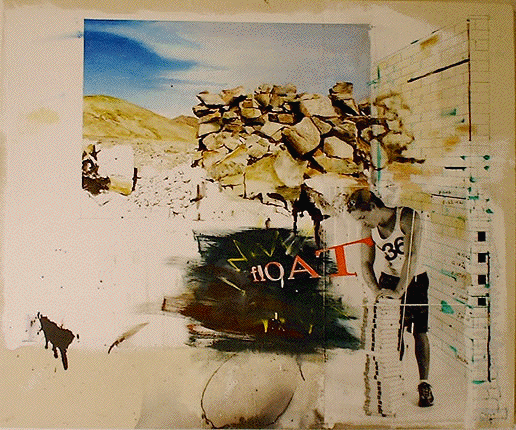 Jack Balas, 2003; FLOAT; oil & enamel on paper mounted to canvas, with ink drawing and B&W photograph; 40"x48"