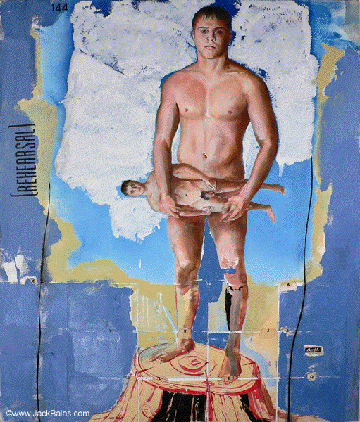 Jack Balas 2005; REHEARSAL (#144); oil, enamel, ink on canvas and collaged manilla filefolders; 38" x 32"