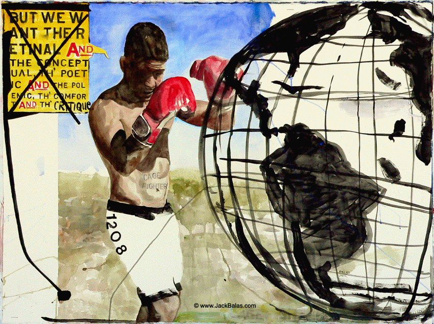 Jack Balas, 2015; "CAGE FIGHTER" (#1208) watercolor, acrylic and ink on paper, 22" x 30" Text: "But we want the retinal AND the conceptual, th' poetic AND the polemic, th' comfort AND th' critique."