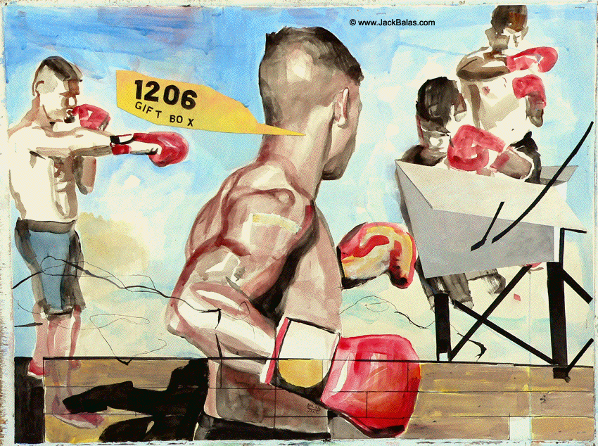 Jack Balas, 2015; "GIFT BOX" (#1206) watercolor, acrylic and ink on paper, 22" x 30"
