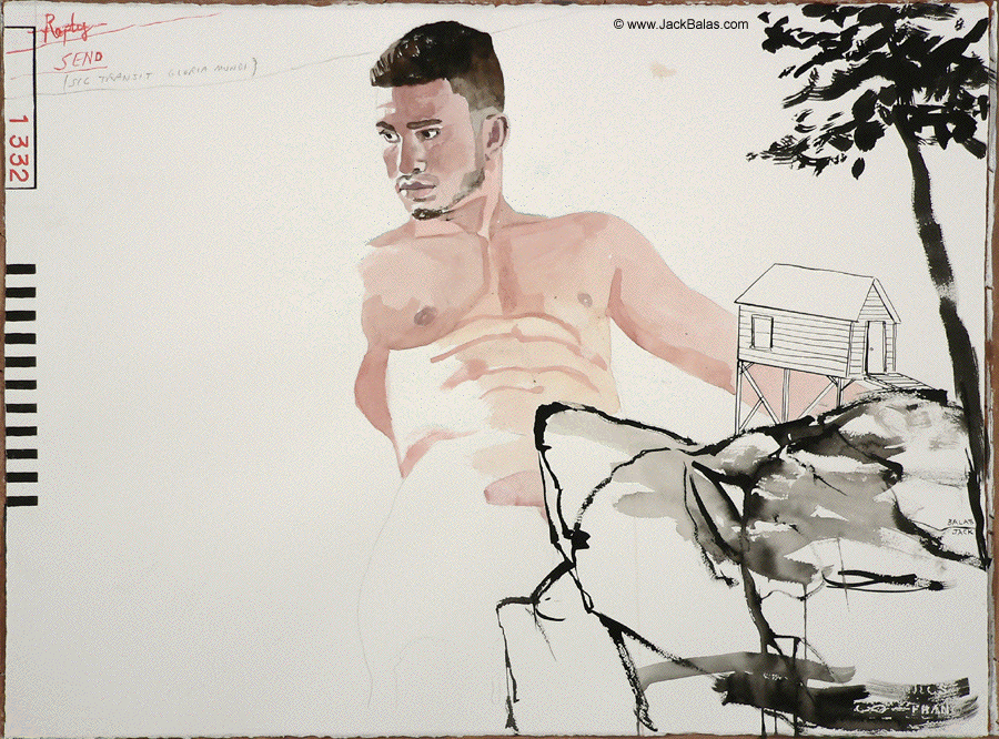 Jack Balas, 2016; SEND (REPLY) (SIC TRANSIT GLORIA MUNDI) (#1332); watercolor, acrylic and ink on paper, 22" x 30"