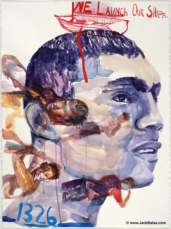 Jack Balas, 2016; WE LAUNCH OUR SHIPS (#1326); watercolor & acrylic on paper, 30" x 22"