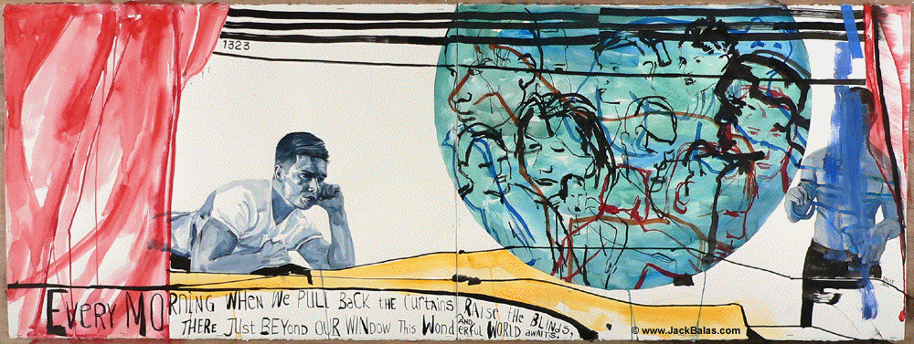 Jack Balas, 2016; THIS WONDERFUL WORLD AWAITS (#1323); watercolor, ink & acrylic on 2 paper panels, 22" x 60" overall (in progress)
