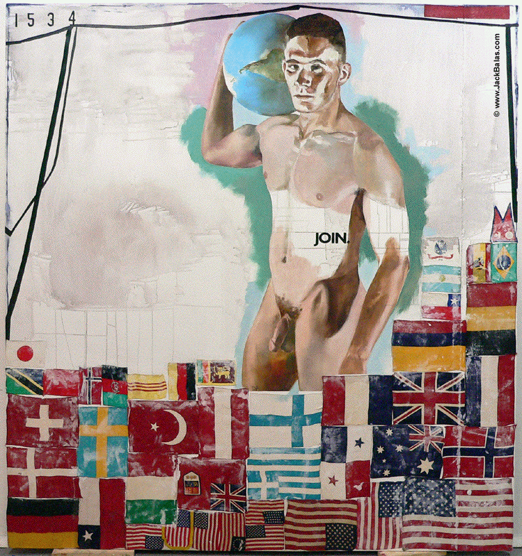 Jack Balas with JOIN (#1534) in progress in the studio. Oil on canvas, 84" x 78", with collage of cotton flags along the bottom.