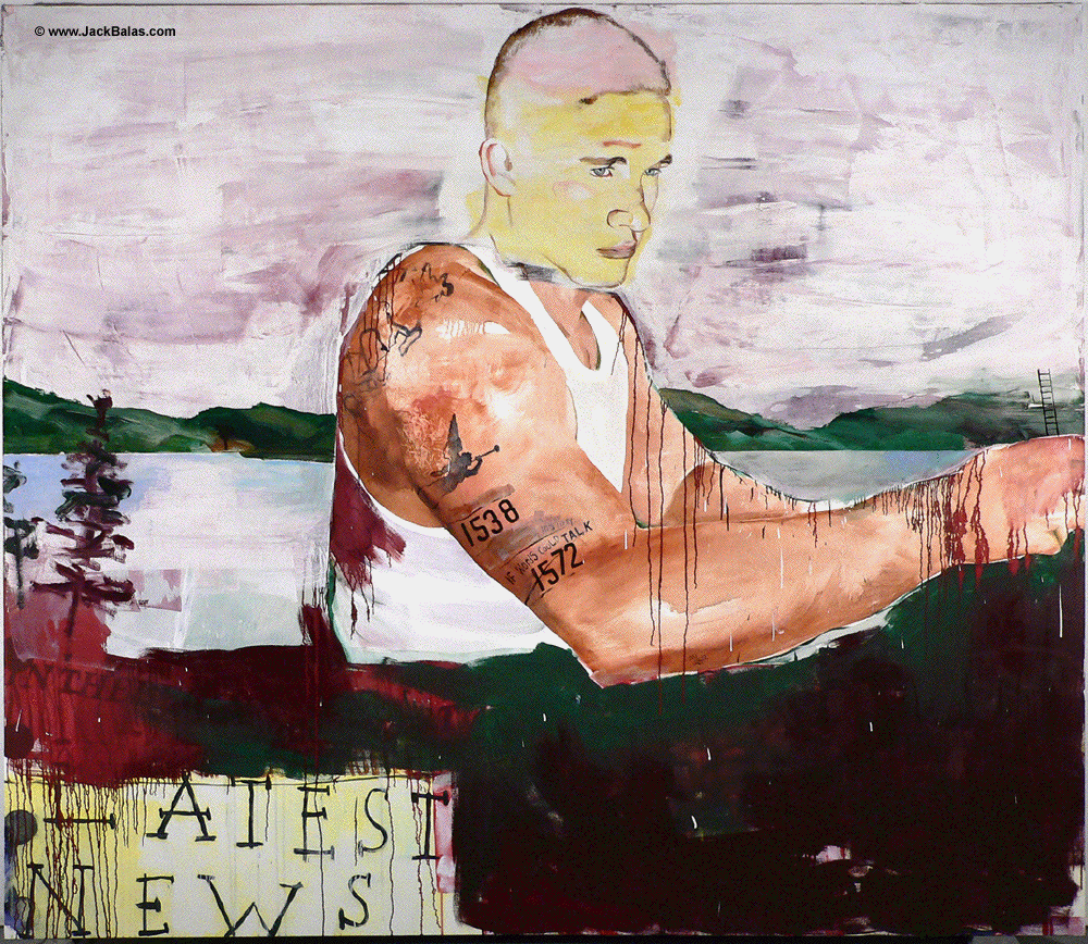Jack Balas, 2018; LATEST NEWS (IF WORDS COULD TALK) (#1538, 1572); oil and enamel on canvas, 76" x 88"