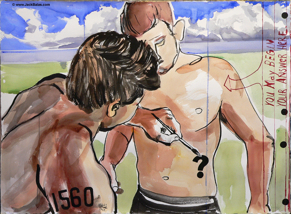 Jack Balas, 2018; YOU MAY BEGIN YOUR ANSWER HERE (#1560); watercolor and ink on paper, 22" x 30"