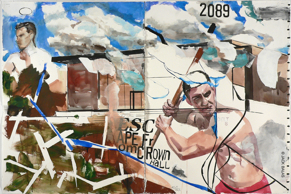 Jack Balas, 2021; ESCAPE FROM CROWN HALL (#2089); India ink and acrylic on 2 paper panels, 30x45 inches overall.