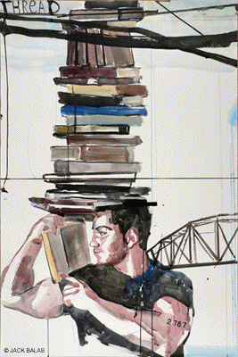 ![]() BOOKS! MY SHELVES ARE OVERFLOWING WITH BOOKS! (#2559); India ink & acrylic on paper, 24x18 inches |