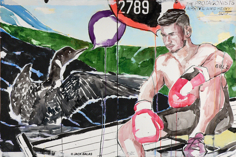 ![]() THE PROTAGONISTS ARRIVE AMID HEAVY SURF (#2789) India ink & acrylic on 2 paper panels, 24 x 36 inches overall |