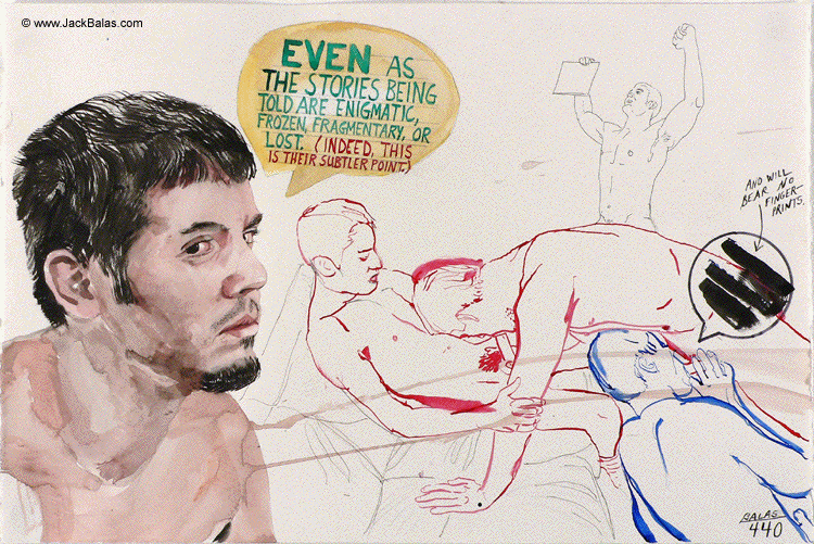 TEXT: 'Even as the stories being told are enigmatic, frozen, fragmentary, or lost. (Indeed, this is their subtler point.).....And will bear no fingerprints."