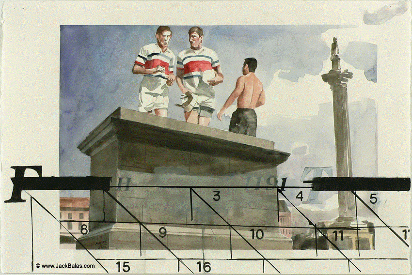 Jack Balas, 2015; THE FOURTH PLINTH (#1191) (Muse/Museum Series); watercolor, acrylic & ink on paper, 15" x 22"