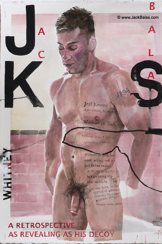 In the 2014 ad for the Whitney's Jeff Koons Retrospective, Koons's "Woman in Tub" makes an appearance from the collection of the Art Institute of Chicago (see ad below). In the MUSE paintng here, this naked man in a shower sports the curatorial wall text from the Art Institute, on his body much like a tattoo. The large J, K and S that have been reproduced in the painting from the ad, are the three letters Jeff Koons and Jack Balas share in their names.