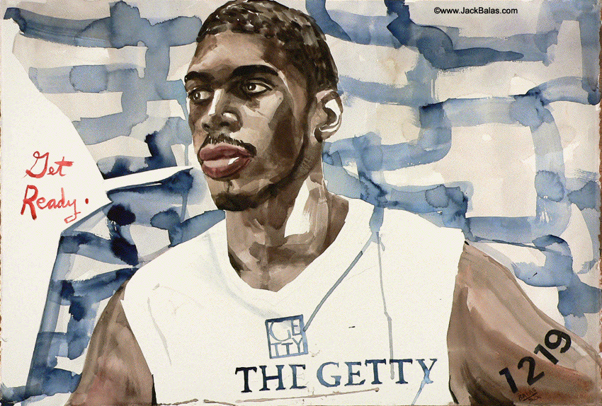Jack Balas, 2015; GETTY, GET READY (#1219) (Muse/Museum Series); watercolor on paper, 15" x 22"