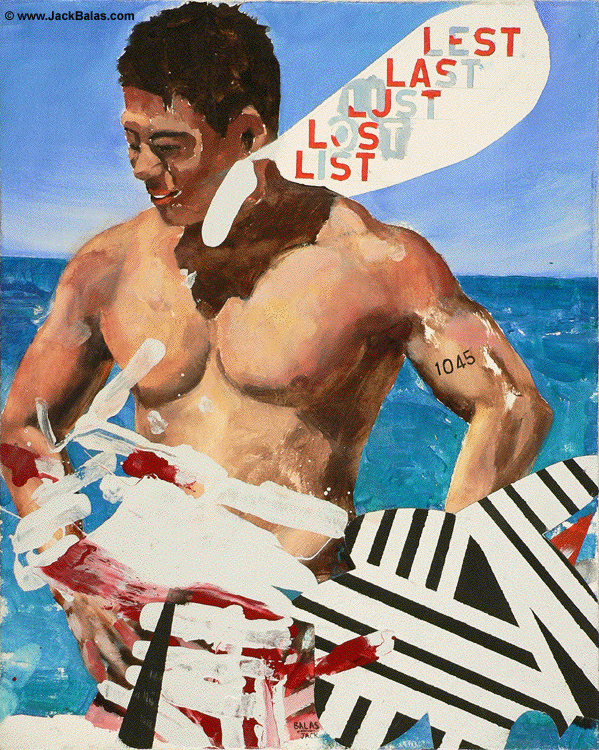 Jack Balas, 2014; LEST LAST LUST LOST LIST (#1045); oil & enamel on canvas, 20" x 16"