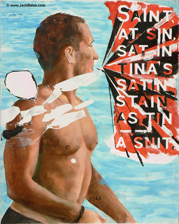 Jack Balas, 2014; SAINT, AT SIN, SAT IN TINA'S SATIN STAIN AS TIN -- A SNIT. (#1044); oil and enamel on canvas; 20" x 16"