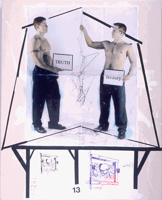 Jack Balas, 2002; TRUTH-BEAUTY (merde) (#13); Oil and ink on B&W photos and paper mounted to canvas with gesso; 40" x 32"